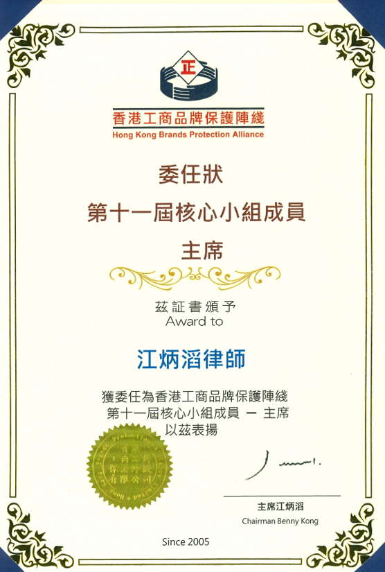 ![]() 2026-2028Mr. Kong has been appointed as the Chairman of the Hong Kong Brands Protection Alliance (2026-2028) ![]() 2024Mr. Benny Kong is honored to be one of the winners of the award “Pro Bono Silver Award ” (1 July 2022- 30 Jun 2023) approved by The Law Society of Hong Kong ![]() 2023In Nov 2023, Mr. Benny Kong and Mr. David Tsai attended the APAA conference in Singapore. ![]() 2023In Nov 2023, Mr. Benny Kong and Mr. David Tsai attended the APAA conference in Singapore. ![]() 2022Mr. Benny Kong is honored to be one of the winners of the award “Pro Bono Silver Award ” (1 July 2021- 30 Jun 2022) approved by The Law Society of Hong Kong ![]() 2021Mr. Benny Kong is honored to be one of the winners of the award “Pro Bono Silver Award ” (1 July 2020- 30 Jun 2021) approved by The Law Society of Hong Kong ![]() 2020Mr. Benny Kong is honored to be one of the winners of the award “Pro Bono Silver Award ” (1 July 2019- 30 Jun 2020) approved by The Law Society of Hong Kong ![]() 2020On 28th October 2020, Mr. Benny Kong attended a conference with the representatives of HKBPA for improvement of the working process of the “Fast Action Scheme” at the Headquarter of the Hong Kong Customs & Excise Department. ![]() 2020On 12th October 2020, Mr. Benny Kong and the representatives of HKBPA visited the Intellectural Property Department. ![]() 2019Mr. Benny Kong is honored to be one of the winners of the award “Pro Bono Silver Award ” (1 July 2018- 30 Jun 2019) approved by The Law Society of Hong Kong ![]() 2017于2017年10月18日,江炳滔律师在香港华人会计师公会(版权专题讲座)担任讲者 ![]() 2017Mr. Benny Kong is honored to be one of the winners of the award “Pro Bono Silver Award ” (1 July 2016- 30 Jun 2017) approved by The Law Society of Hong Kong ![]() 2016Mr. Benny Kong is honored to be one of the winners of the award “Pro Bono Silver Award ” (1 July 2015- 30 Jun 2016) approved by The Law Society of Hong Kong ![]() 2015Partner Mr Benny Kong was appointed as the Legal Advisor of The HK Enterprises Association of Dongguan Qingxi. ![]() 2014Mr. Benny Kong is honored to be one of the winners of the award “Pro Bono Silver Award ” (1 July 2013- 30 Jun 2014) approved by The Law Society of Hong Kong ![]() 2014A photo (from front left to right: Mr Thomas Tsang (Assistant Director of IPD), Mr Benny Kong (Vice President of HKIPA), Ms Ada Leung (Director of IPD) and Dr Lewis Luk (Chairman of HKIPA) taken at the meeting room of the IPD after a conference between the respective representatives of Hong Kong Intellectual Property Department and Hong Kong Institute of Patents Attorneys on 4th July 2014. |